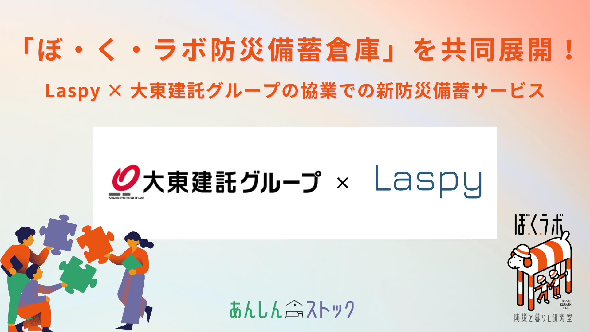 防災備蓄のワンストップサービスを提供する株式会社Laspy(本社:東京都千代田区、代表取締役:薮原 拓人、以下「当社」)は、この度、大東建託株式会社(本社:東京都港区、代表取締役社長 執行役員 CEO:竹内 啓 )および大東建託パートナーズ株式会社(本社:東京都港区、代表取締役社長:松本 與喜)と協業し、新たな防災備蓄サービス「ぼ・く・ラボ防災備蓄倉庫」の提供を2025年10月より開始します。